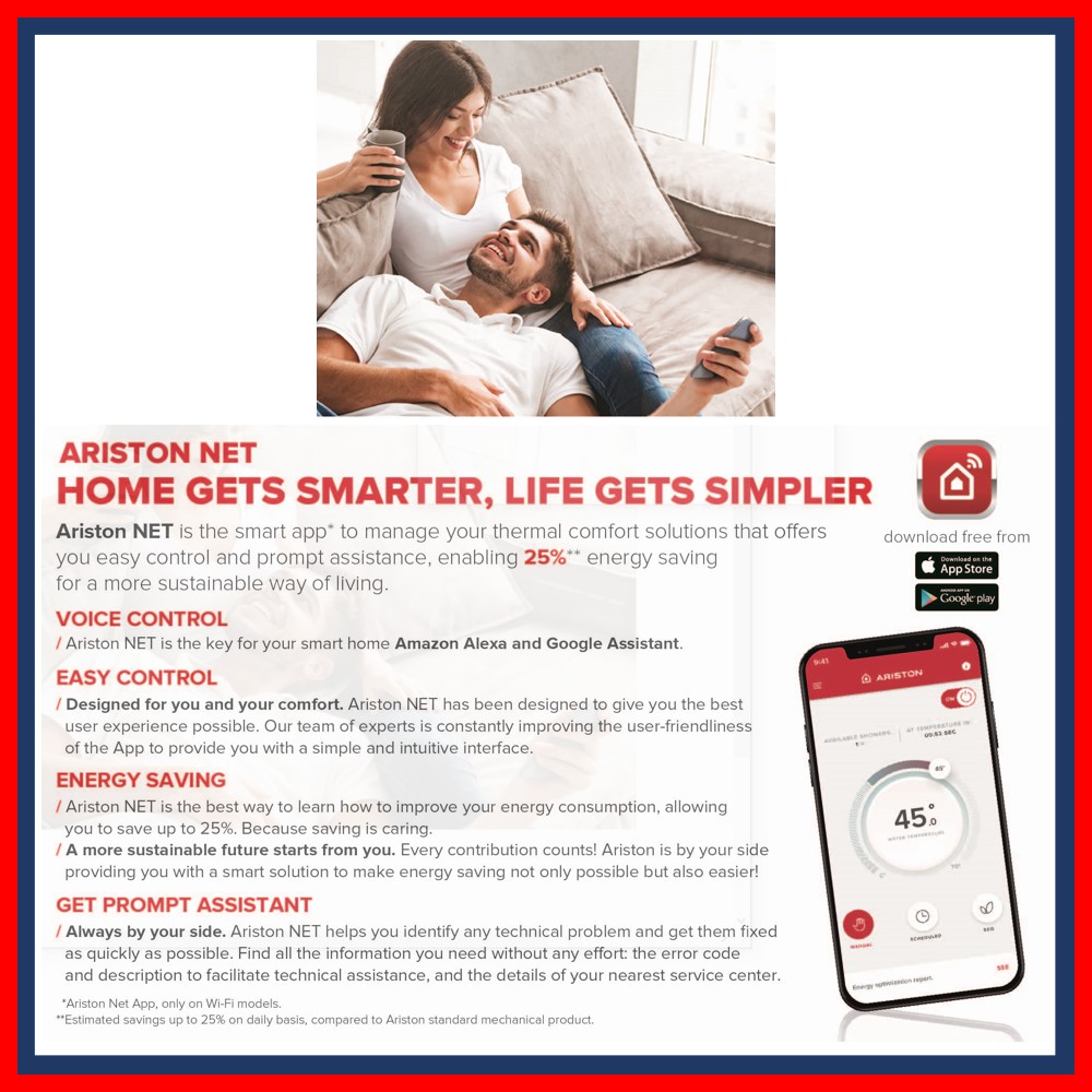Ariston NET is the smart app to manage your thermal comfort solution that offers you easy control and prompt assistance, enabling energy saving for a more sustainable way of living. It is proven to guarantee seamless operation and compatibility with the main loT solution operation and compatibility with the main loT solution: Amazon Alexa and Google Assistant.