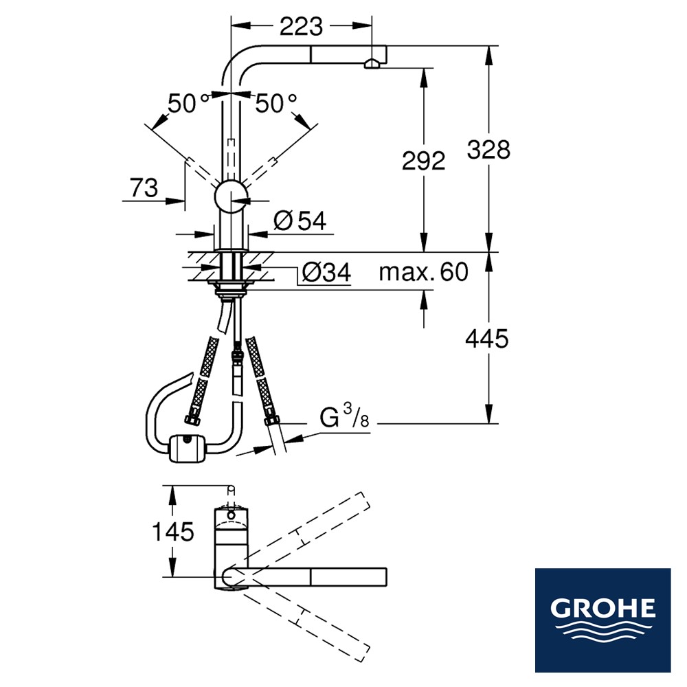 GROHE MINTA KITCHEN TAP – L-SHAPED SWIVEL SPOUT AND PULL-DOWN SPRAY IN GROHE SUPERSTEEL
