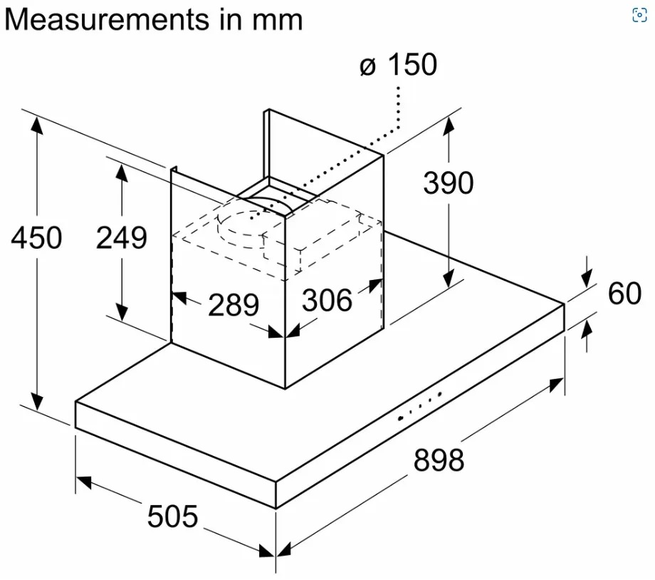 - Dimensions recirculating (HxWxD mm): 450-840 x 900 x 505